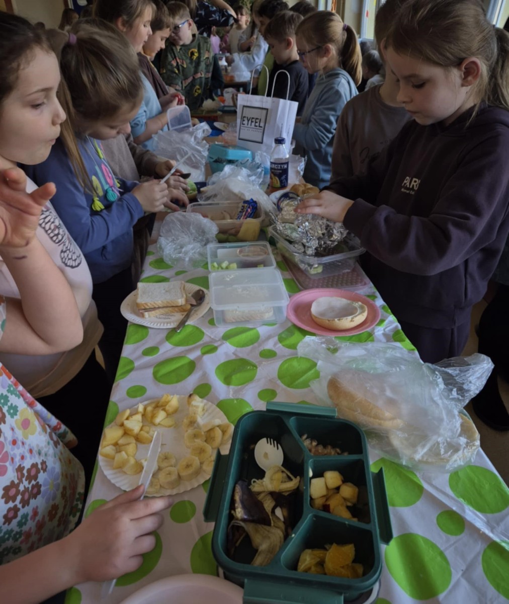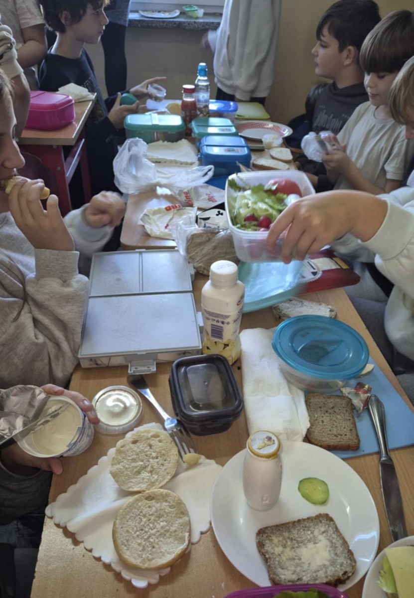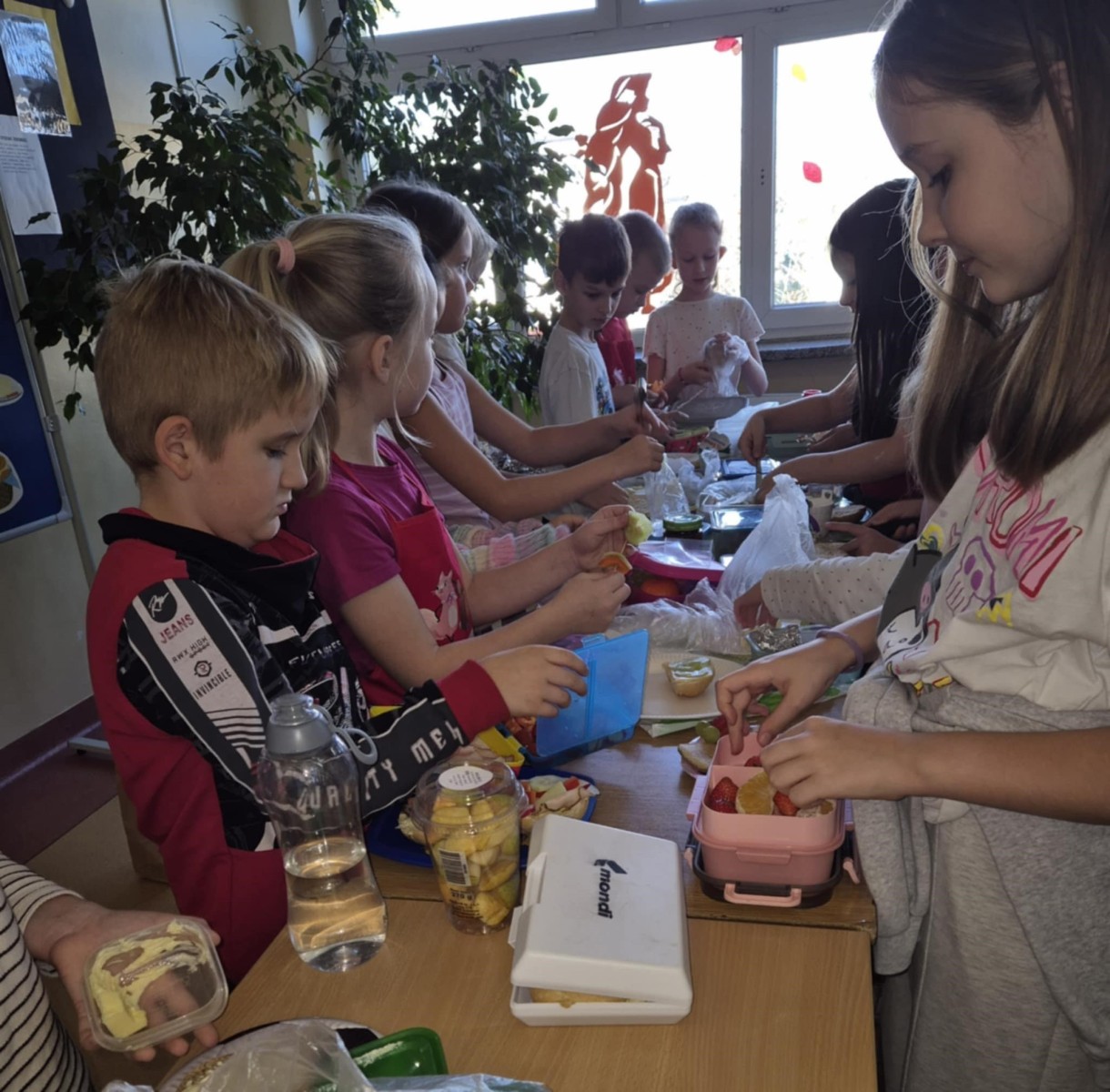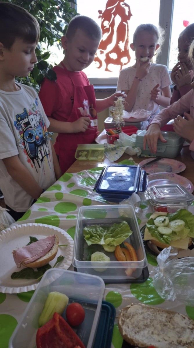 👉 Uczniowie klas I–IV wykazali się ogromną kreatywnością – przygotowywali kolorowe kanapki, sałatki i soki owocowe, udowadniając, że zdrowe jedzenie może być pyszne i ciekawe! 😋