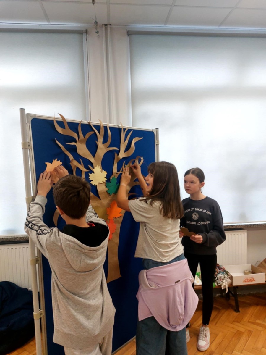 🌿 „Drzewo zdrowych nawyków” – na symbolicznych liściach uczniowie zapisywali swoje zdrowe przyzwyczajenia, które wspólnie stworzyły barwne drzewo promujące pozytywne postawy żywieniowe.