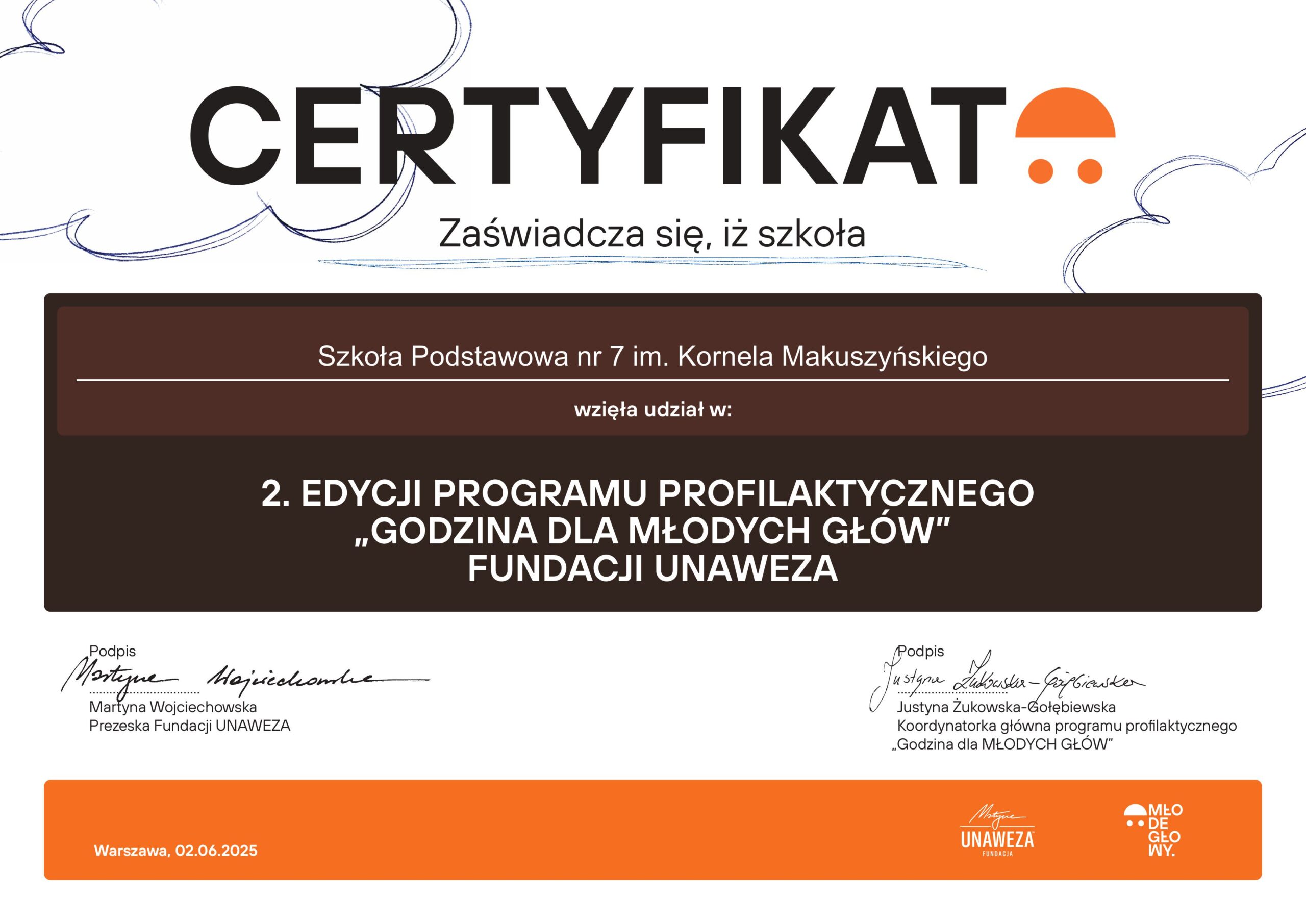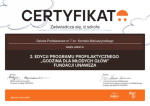 Z dumą prezentujemy Certyfikat uczestnictwa w 2. edycji Programu Profilaktycznego „Godzina dla Młodych Głów” 💙