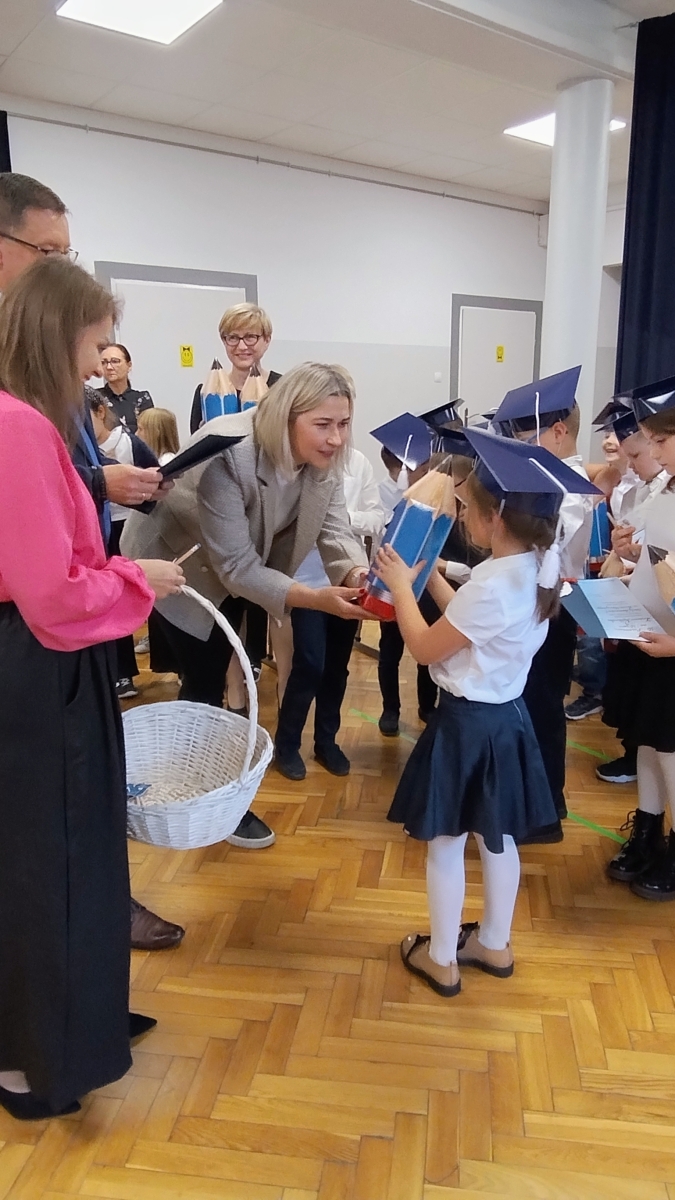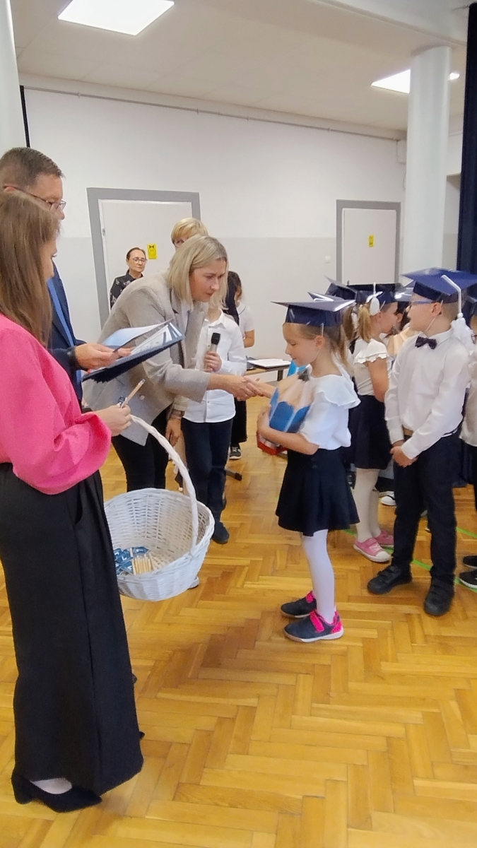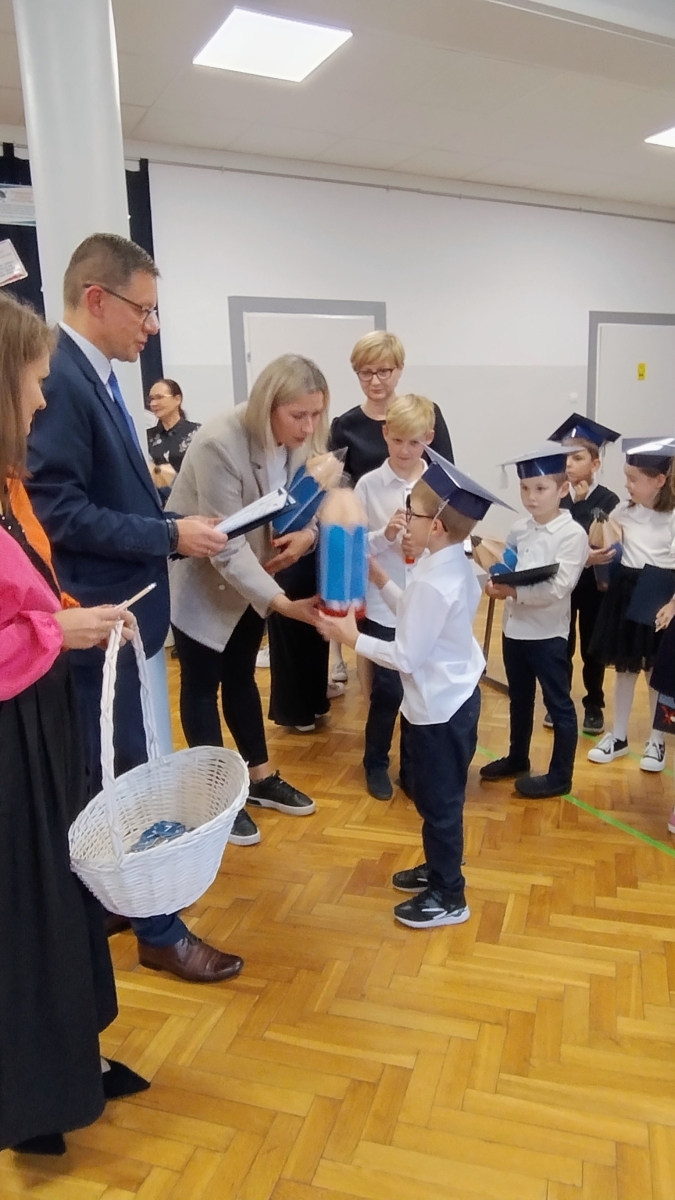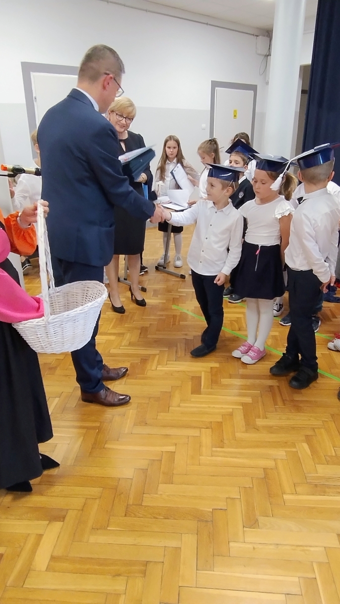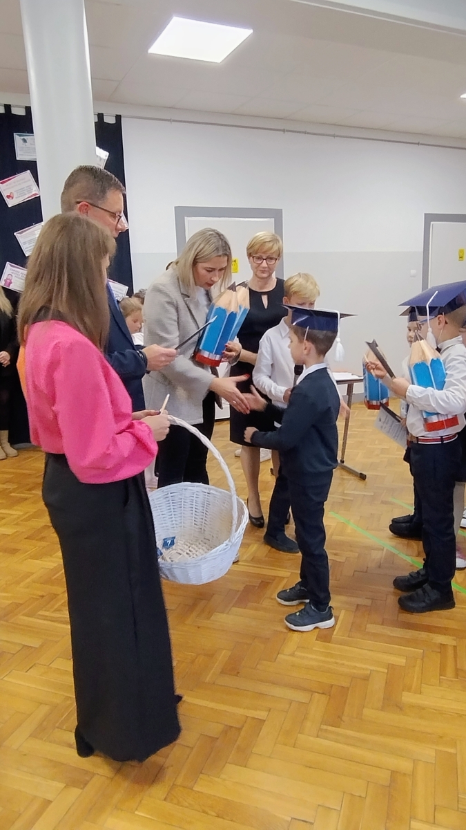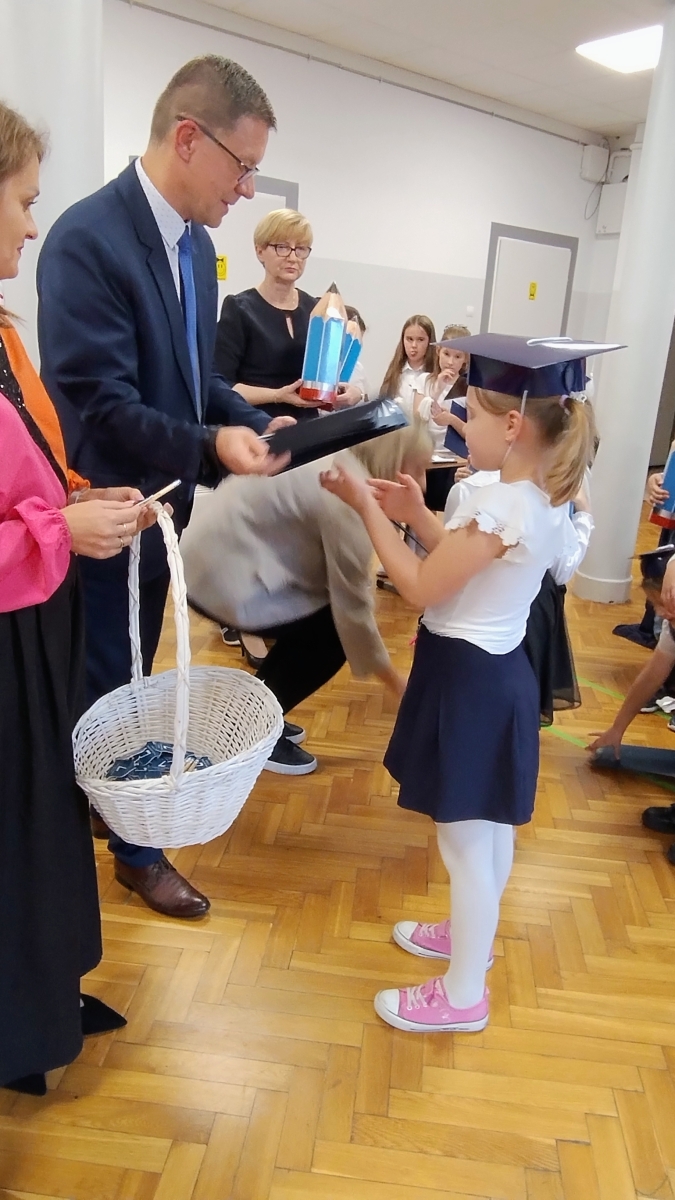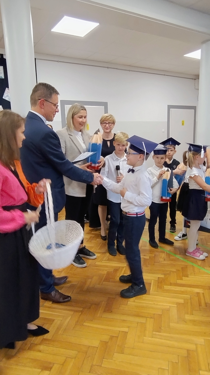 Po ślubowaniu przy sztandarze szkoły, nastąpił Akt pasowania, dokonany symbolicznym ołówkiem przez Pana Dyrektora Marka Czarnotę. Najmłodsi uczniowie oficjalnie zostali przyjęci do społeczności szkolnej. Nie zabrakło również życzeń i upominków.