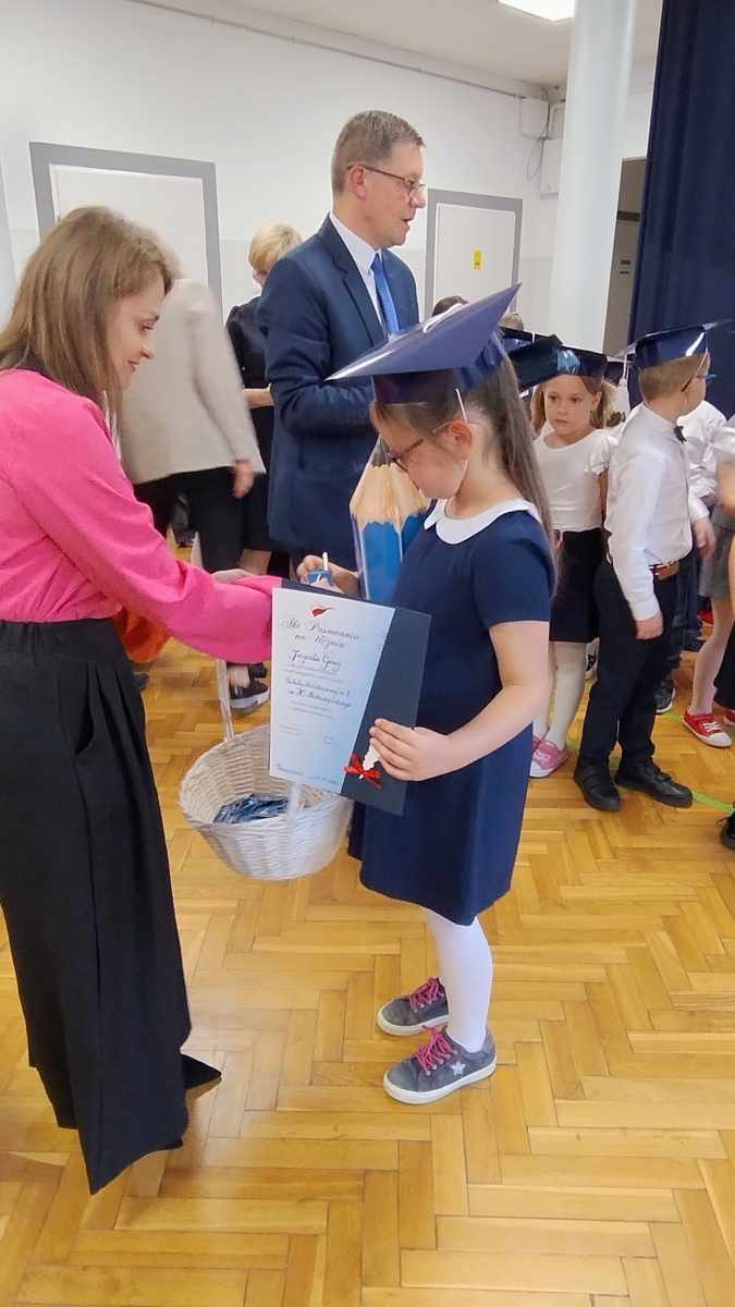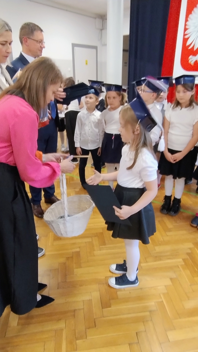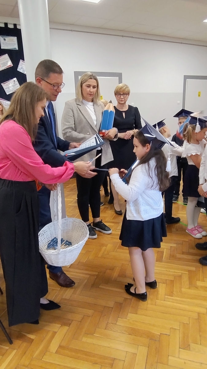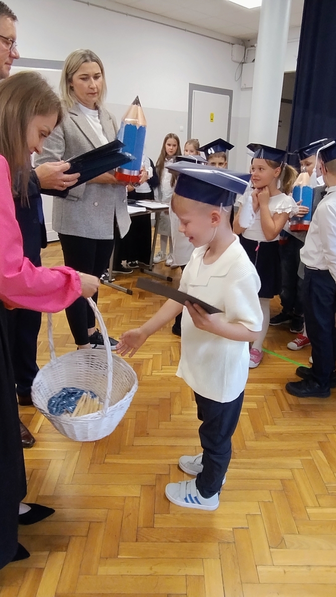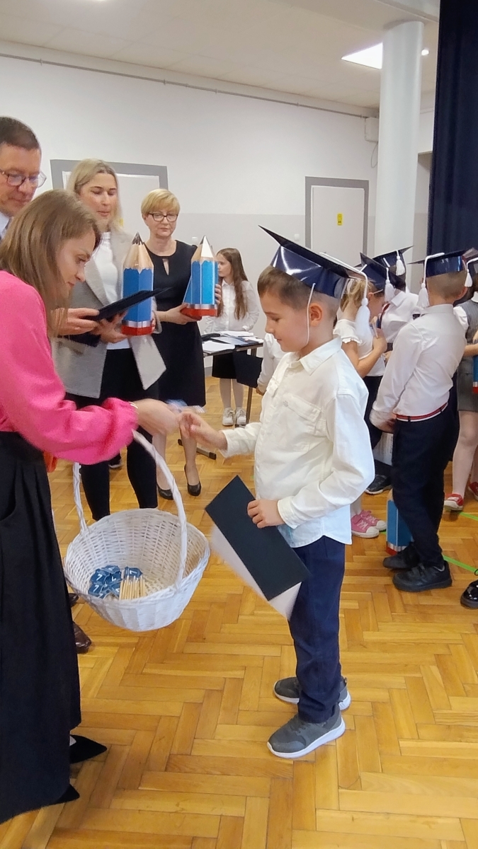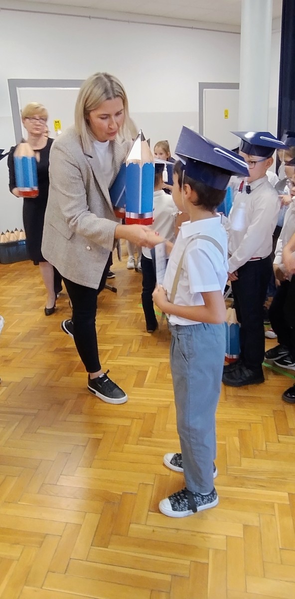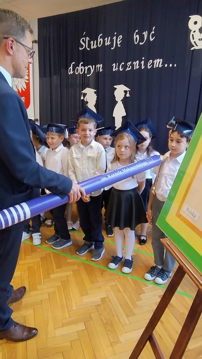 Po ślubowaniu przy sztandarze szkoły, nastąpił Akt pasowania, dokonany symbolicznym ołówkiem przez Pana Dyrektora Marka Czarnotę. Najmłodsi uczniowie oficjalnie zostali przyjęci do społeczności szkolnej. Nie zabrakło również życzeń i upominków.