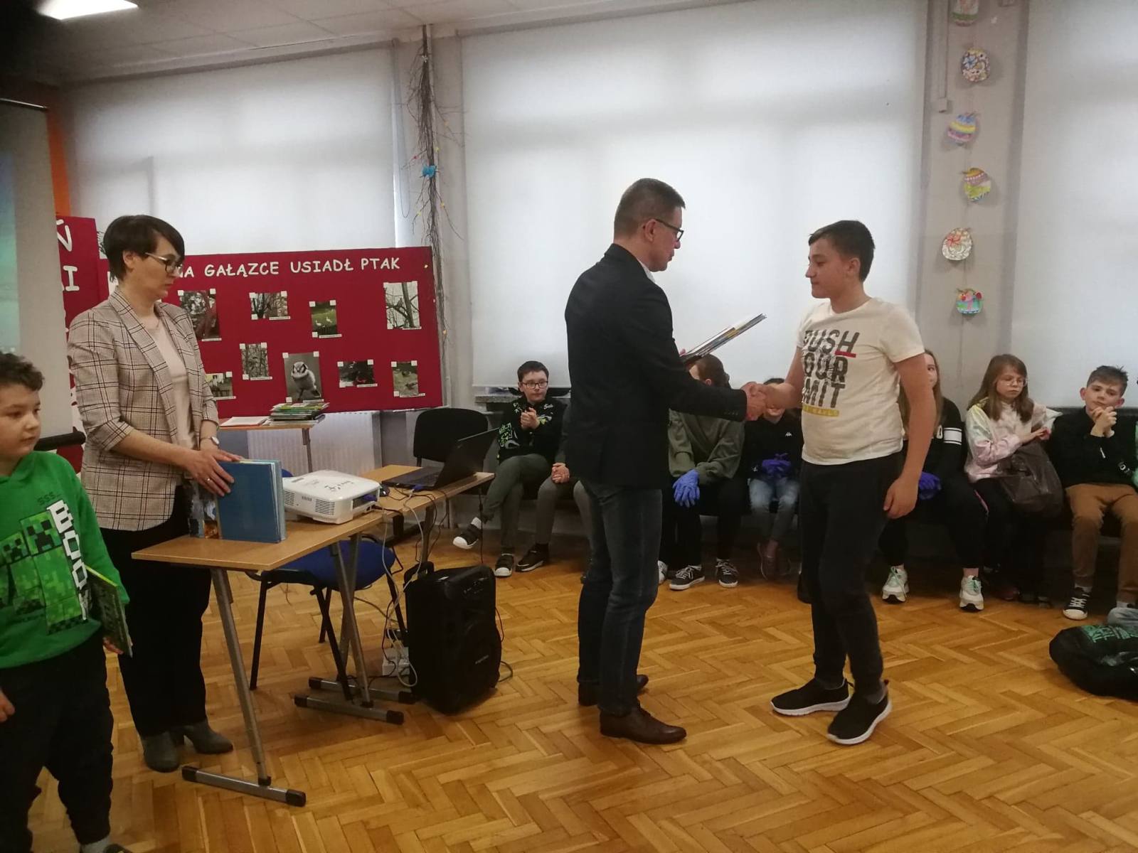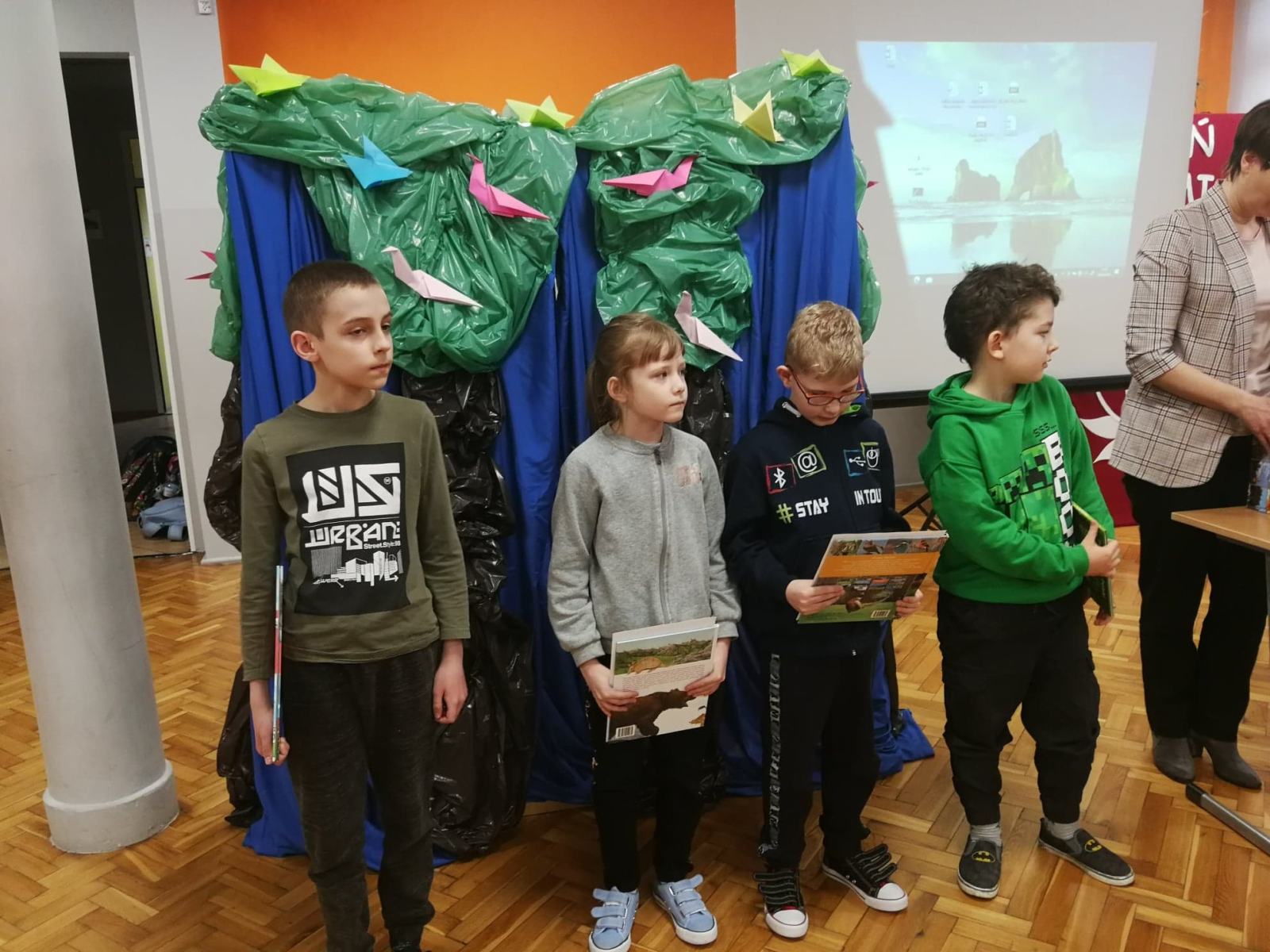 Dzień Ziemi to coroczne wydarzenie obchodzone w celu promowania ochrony środowiska, poszerzania świadomości ekologicznej i inspirowania do życia w zgodzie z naturą. Uczniowie naszej szkoły również przyłączyli się do obchodów tego święta. Wzięli udział w zorganizowanym przez Pani Barbarę Pietrzyk quizie ekologicznym oraz konkursie plastycznym na plakat i zakładkę pt.: „Nie pal śmieci – segreguj odpady”. Uczestniczyli też w konkursie fotograficznym pt.: „Na gałązce usiadł ptak”. Podczas uroczystego apelu przygotowanego na tę okazję zwycięzcy konkursów odebrali dyplomy oraz nagrody książkowe. Następnie wszyscy obejrzeli film edukacyjny na temat naszej planety oraz zagrożeń płynących z działalności człowieka. Na zakończenie uczniowie klasy 4b wcielili się w rolę ptaków i wystąpili w inscenizacji wiersza Juliana Tuwima „Ptasie radio”, którą przygotowali w ramach realizacji projektu edukacyjnego „Pracownia pod chmurką”.