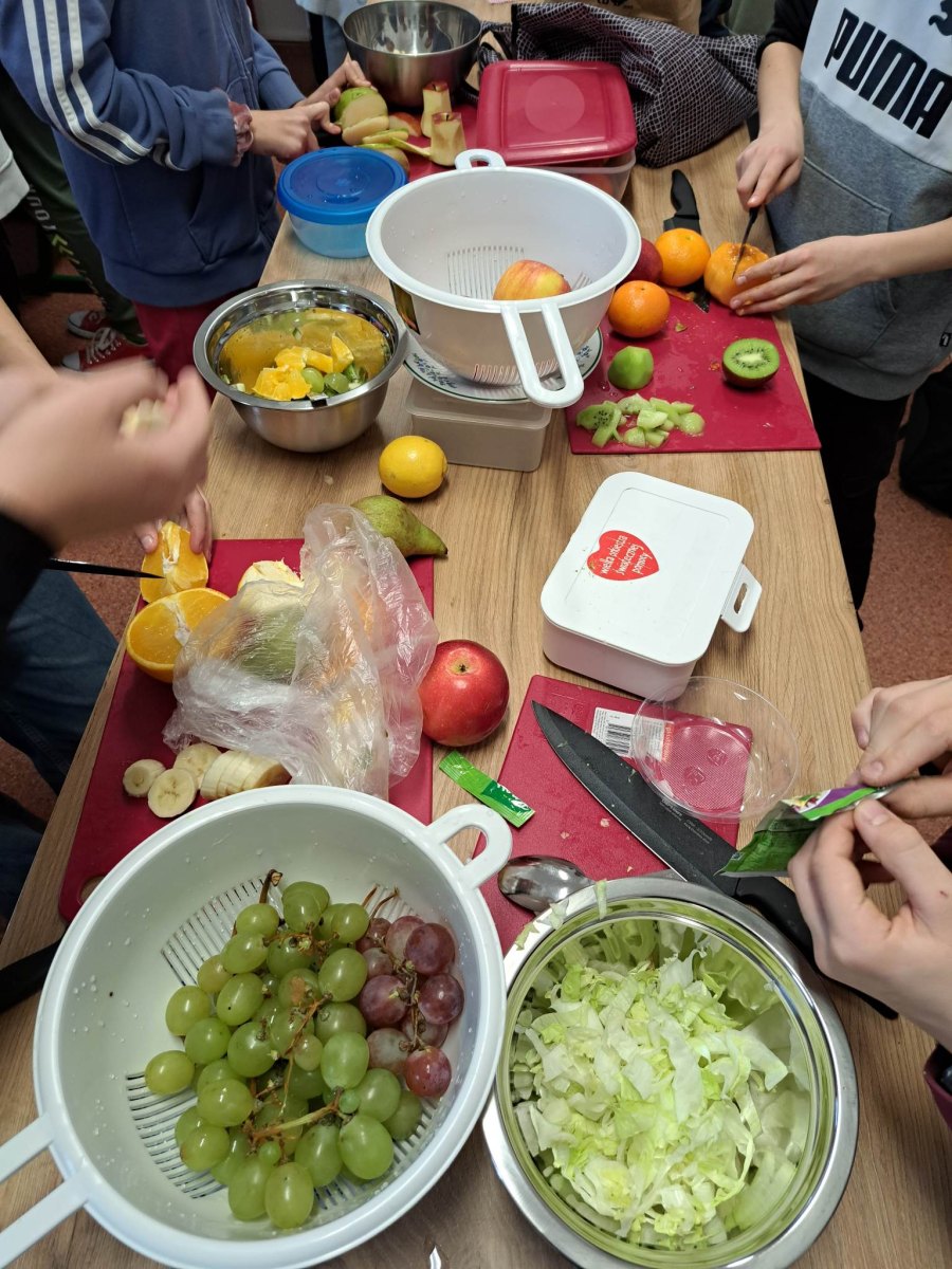 Kulinarna podróż uczniów SP 7 trwa w najlepsze. Tym razem uczniowie klasy 6 A przygotowywali sałatki i surówki. Do wyboru, do koloru, warzywa, owoce, dodatki, na co ktoś miał ochotę. Przy okazji podróżnicy poznali grupy składników pokarmowych i przypisywali produkty do właściwej grupy. Podróżujemy dalej. Wszystko wskazuje na to, że kolejna stacja na trasie to „Desery”. Ciekawe jakie pomysły przyjdą podróżnikom do głowy?